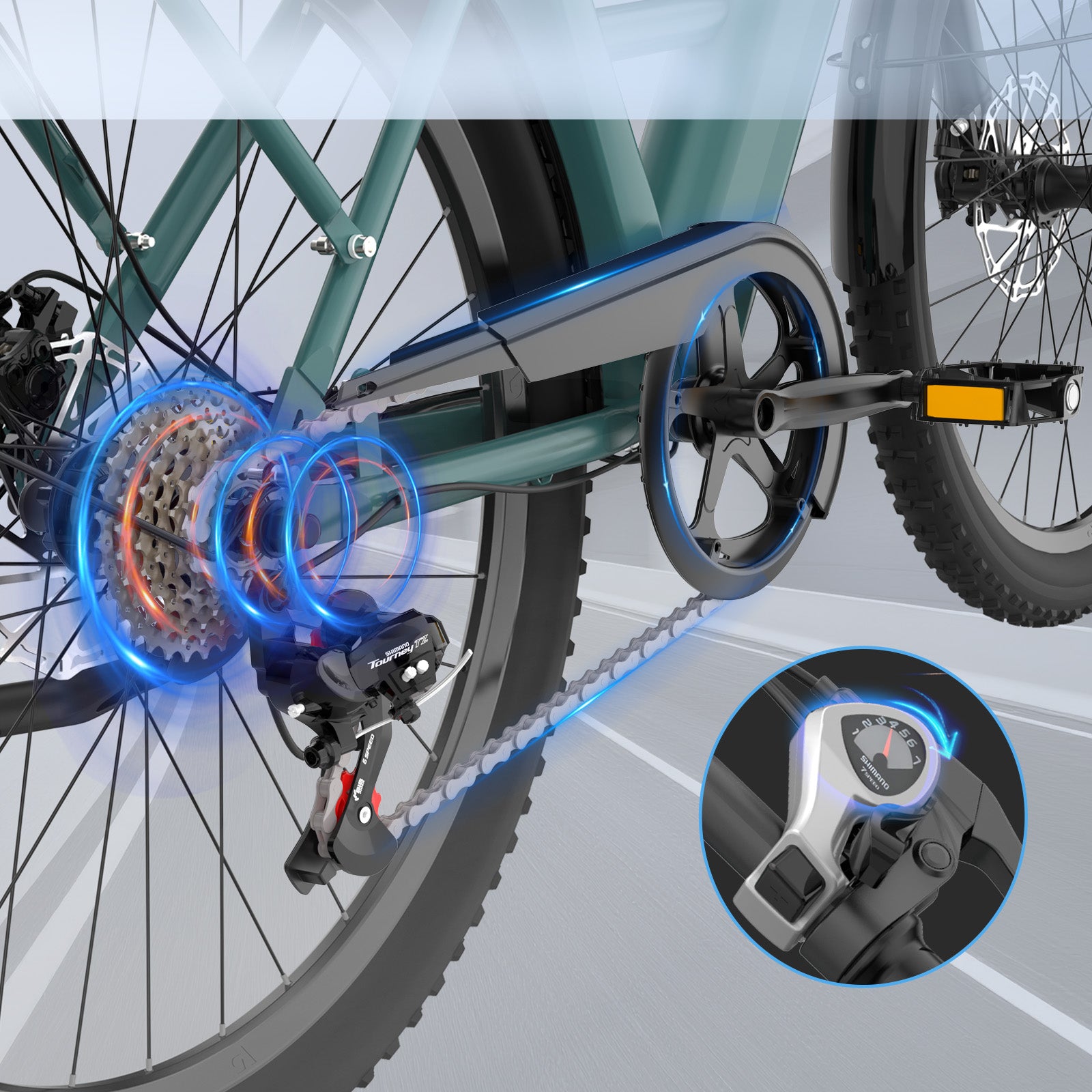 Shimano 7-speed system delivers smooth gear changes for climbing hills, cruising city streets, and everything in between.