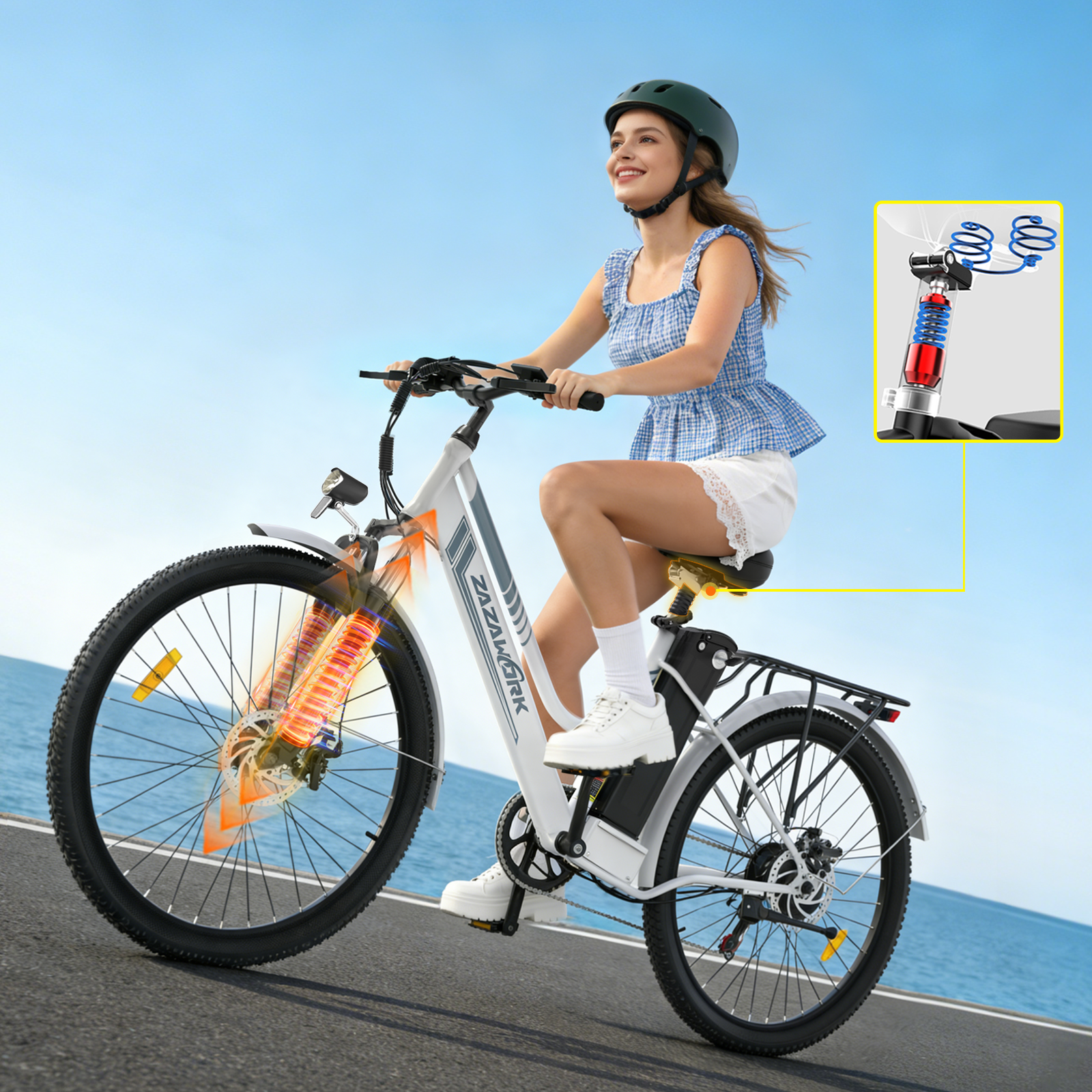 The seat spring suspension softens bumps and vibrations for a smoother, more comfortable ride—perfect for long commutes or rough terrain.